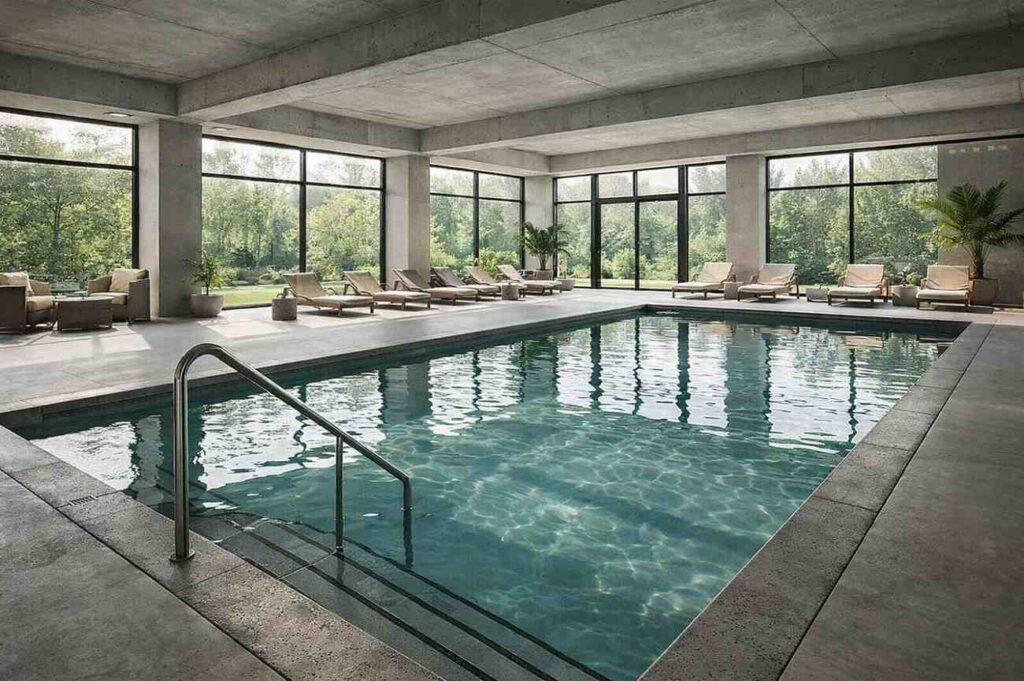 Concrete allows full customization of size, depth transitions, bench seating, and structural configuration for large or compact indoor pools.